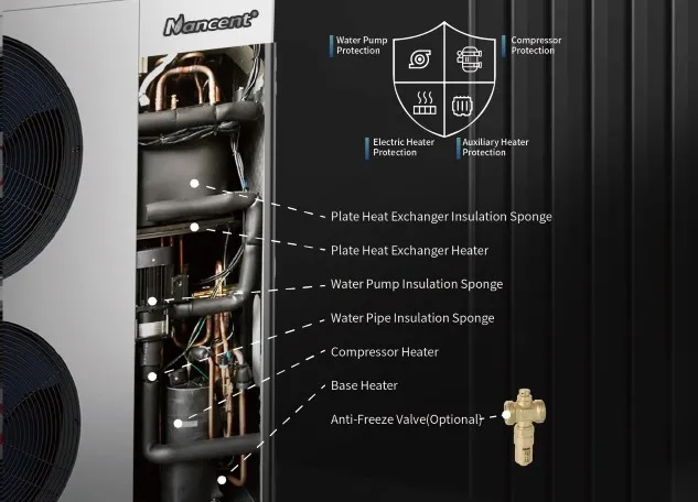 Con la logica di controllo antigelo avanzata di Nancent, l'unità può controllare in modo intelligente il compressore, la pompa dell'acqua, il riscaldatore elettrico e altri riscaldatori ausiliari per realizzare la quadrupla protezione, garantendo che la pompa di calore non si congeli anche durante il freddo inverno.
